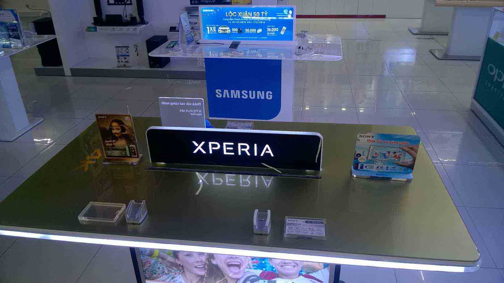 – Về đèn led sử dụng cho bàn trải nghiệm của Sony rất đa dạng, từ các mẫu led dây 5630 thông dụng đến các dòng đèn led mới ra có chíp đi theo như dòng 9803, 6803..ở 1 số tỉnh than hf miền trung, bàn trải nghiệm còn lắp thêm các đèn led GRB đổi màu rất đẹp, có thể nháy theo điệu nhác để gây tò mò đối với khách hàng đến xem sản phẩm của mình. Với các chất liệu mica nhiều loại, từ mica trong mica màu, các độ dày mica cũng khác nhau, đối với mica 8mm để giưới thiệu sản phẩm được khắc âm rãnh bằng mica, trong gắn led với ánh sáng màu vàng ấm toát lên vẻ sang trọng của sản phẩm mà nó đang trưng bày để mọi người trải nghiệm.
